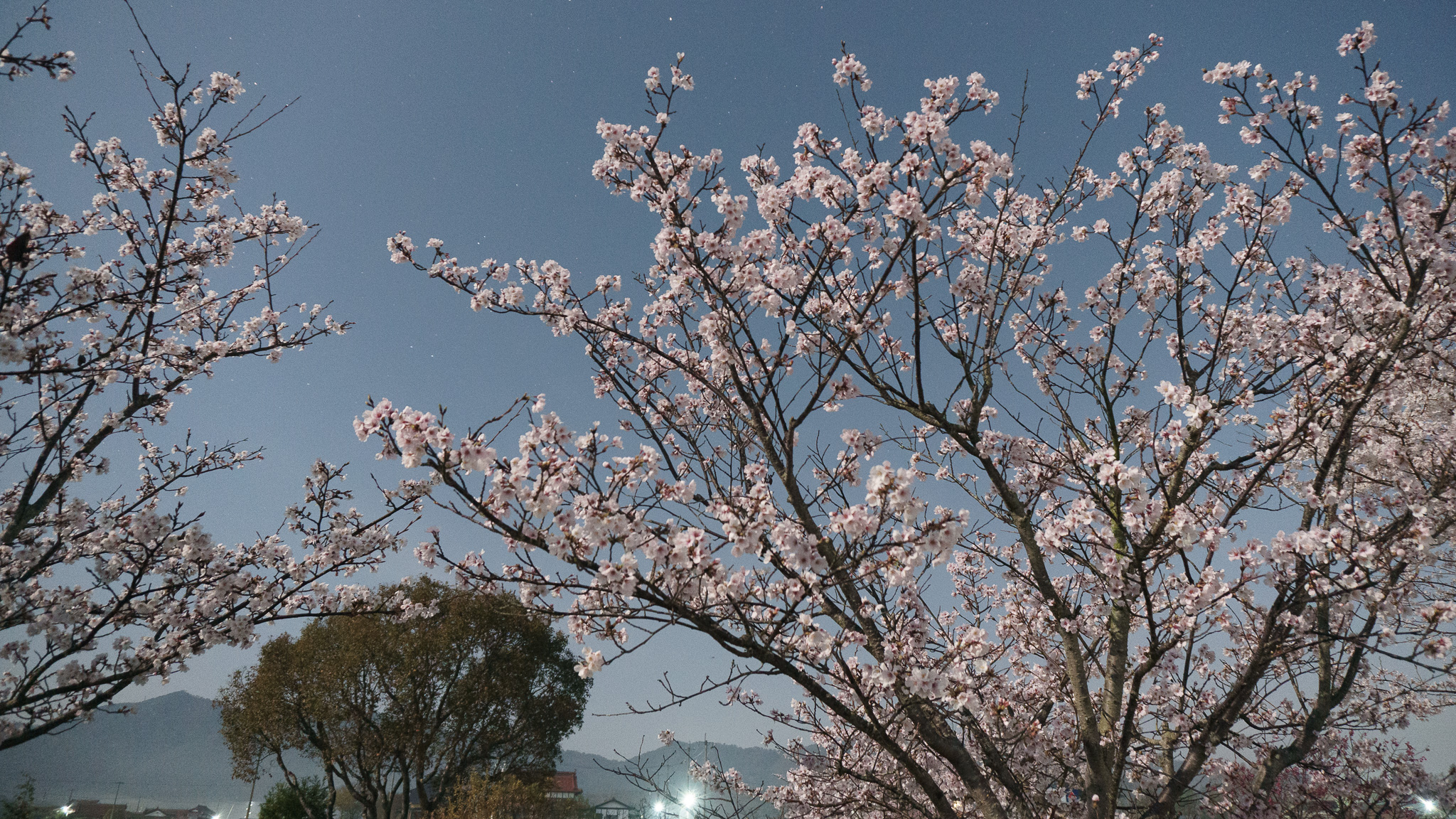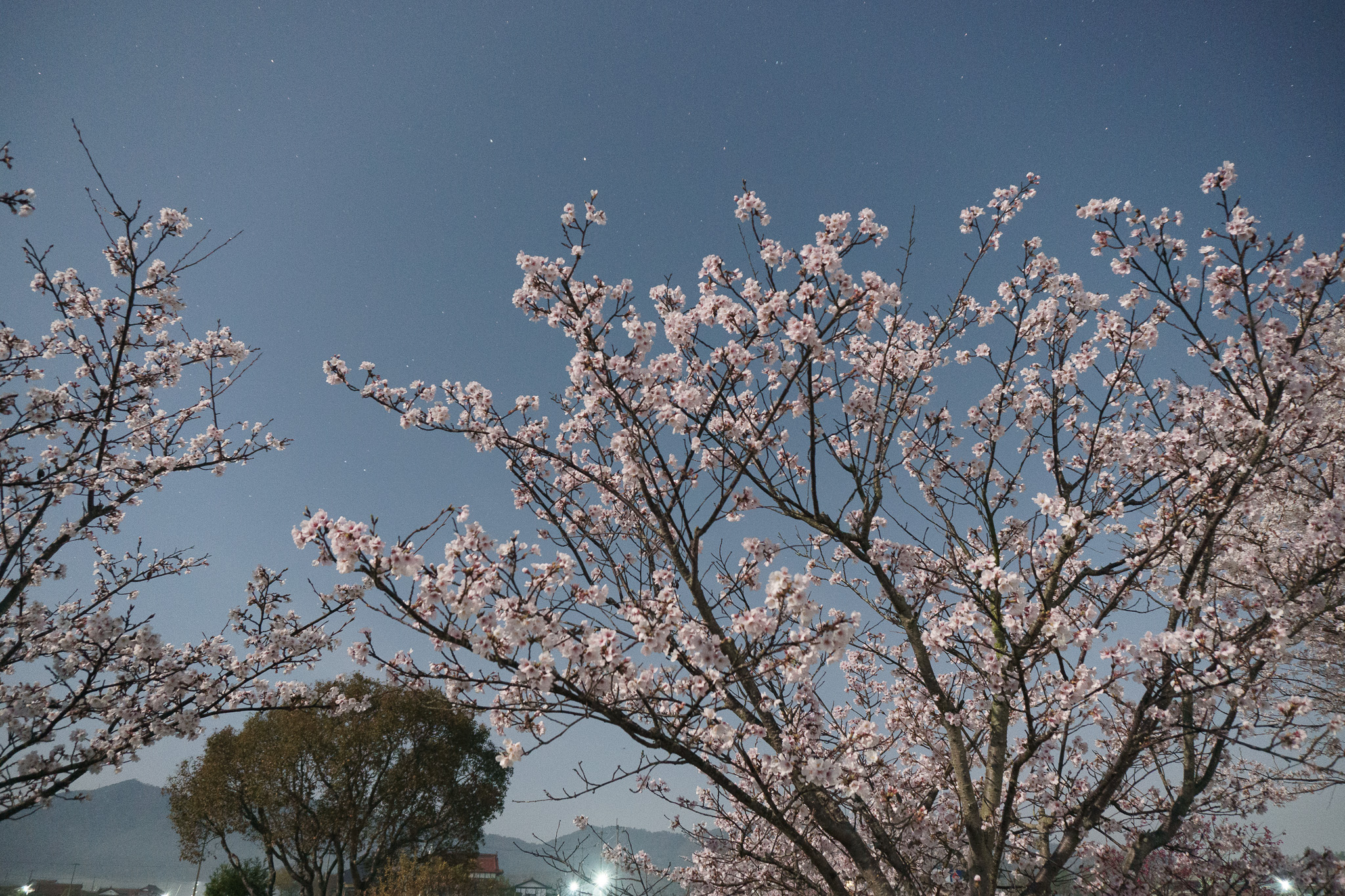 ほぼ月明かりで撮ったが、カメラから少し離れた場所(斜め後ろ)に街灯があり、その光がゼロではない。背景には街灯が数箇所見える。